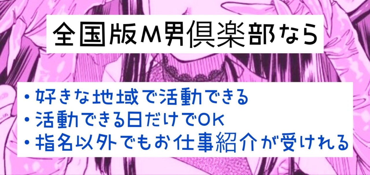 現在M男倶楽部のM男くんはほとんどが大阪在住ですが、現在も全国から多数のご応募がきております。 皆さん自分のM気質を普段の生活ではなかなかオープンにできず苦悩されています。 そこで!関西圏には出れないけれどM男活動がしたいというM男くんのために簡単にキャスト登録ができる新たな採用枠を設けました。 好きな時間に好きな地域でM男活動ができるので、遠方だと諦めていたM男くんお待ちしています!