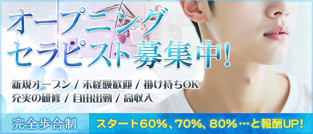 新規オープニングセラピスト、オフィススタッフ募集中! 新人セラピストさんには充実の研修制度があり、心配なくスタートすることができます! 充実の研修内容、プロによる指圧整体、アロマオイル、マッサージや性感、マッサージ、すべての1連の業務を1からお教えします! 報酬に関してもスタートが60%よりスタート! その後、セラピストさんのランク別により70% 80%と上がって行きます! ご自分の実力で自分の収入を増やすことが可能ですので、その応援を弊社はさせていただきます! 出勤も自由出勤となっております。月一回からフル出勤に至るまでご自分の都合により出勤が可能となっております。