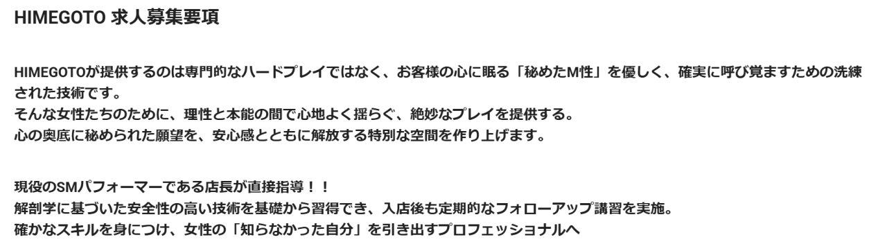 HIMEGOTO 求人募集要項 HIMEGOTOが提供するのは専門的なハードプレイではなく、お客様の心に眠る「秘めたM性」を優しく、確実に呼び覚ますための洗練された技術です。 そんな女性たちのために、理性と本能の間で心地よく揺らぐ、絶妙なプレイを提供する。 心の奥底に秘められた願望を、安心感とともに解放する特別な空間を作り上げます。 現役のSMパフォーマーである店長が直接指導!! 解剖学に基づいた安全性の高い技術を基礎から習得でき、入店後も定期的なフォローアップ講習を実施。 確かなスキルを身につけ、女性の「知らなかった自分」を引き出すプロフェッショナルへ